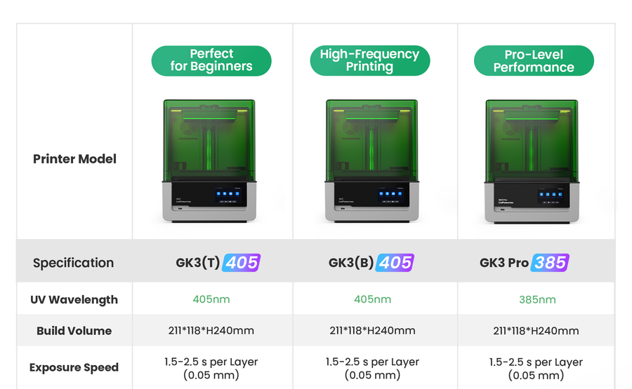The GK3 Pro stands out with its 385 nm light source and the use of high-transparency screens. The GK3 Ultra, on the other hand, offers a generous build volume of 30 x 30 x 16 cm and always uses the biscrew system.
